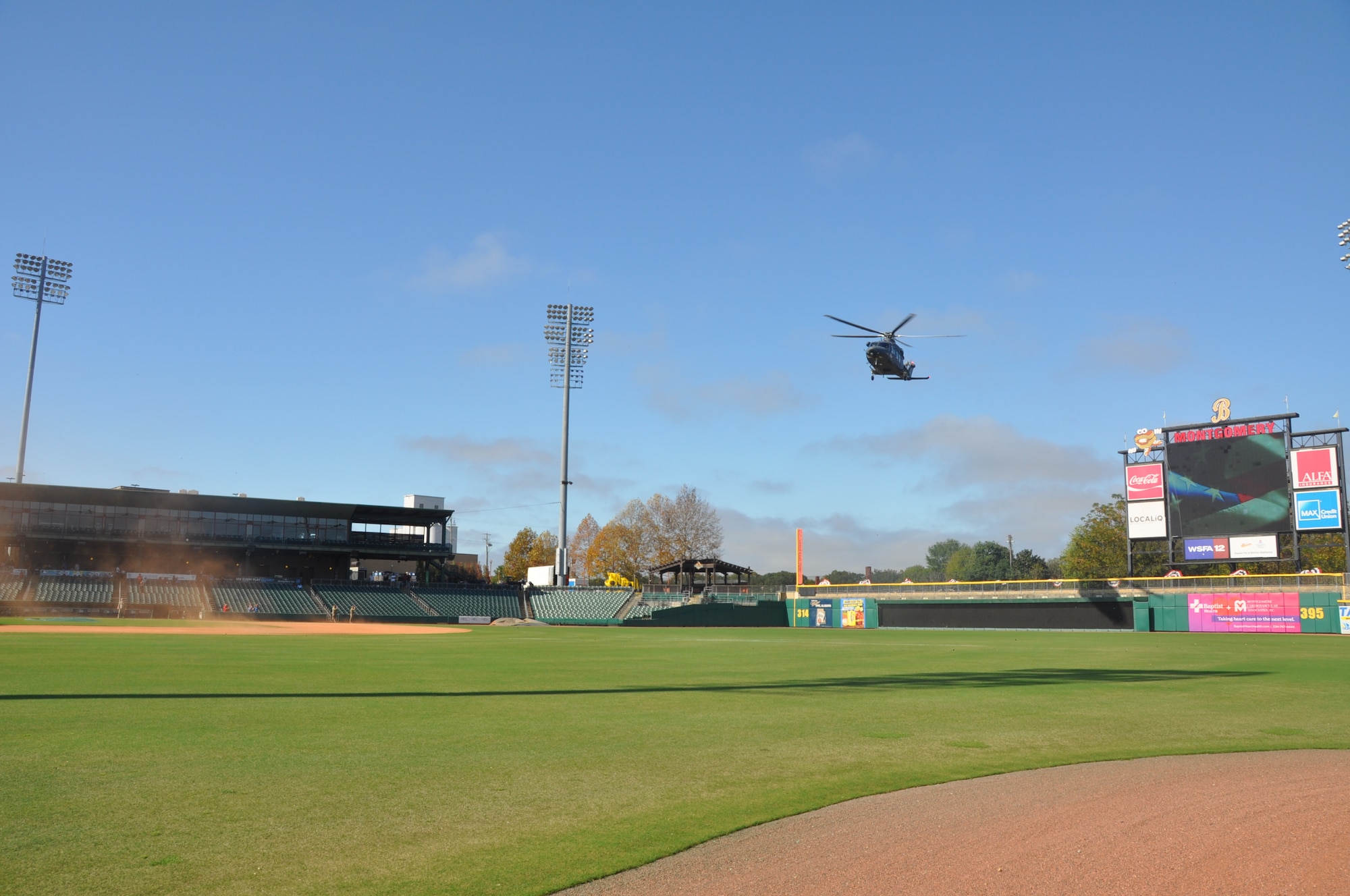 A highlight of the event was when a 908th FTW MH-139A Grey Wolf helicopter flew over the stadium and then landed in center field, providing a show of the wing’s new mission.